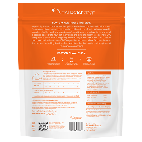 Complete and Balanced – Smallbatch Dog Chicken Recipe is formulated to meet the nutritional levels established by the AAFCO Dog Food Nutrient Profiles for all life stages excluding growth of large size dogs.